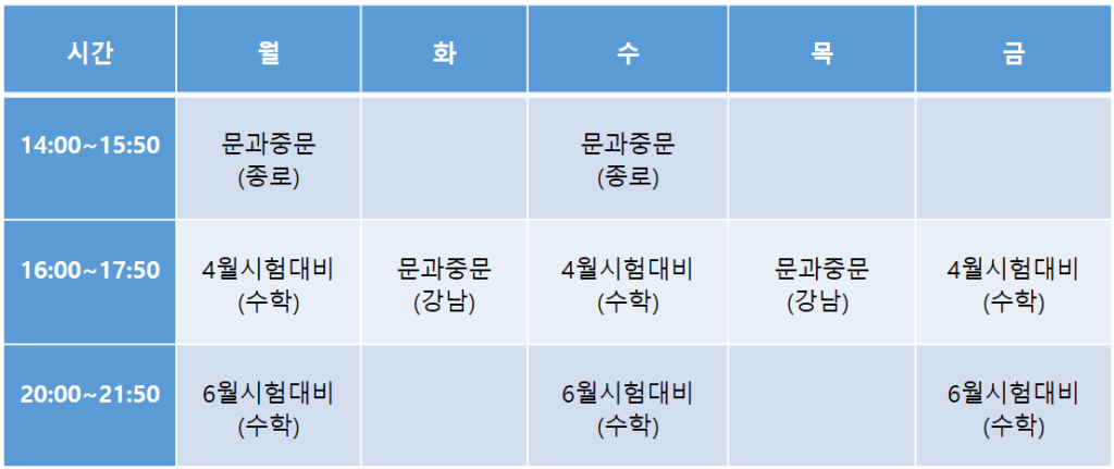 중국명문대학 입시반 북경대 청화대 인민대 교통대 복단대 화동사범대 중산대 남경대 천진대 커리큘럼 수학 중문 면접대비반 🔵 1–4주차 | 기초 개념 정리 구간구분1주차2주차3주차4주차단원명집합부등식로그·지수함수상세 커리큘럼집합의 개념집합의 연산2차 부등식절댓값 부등식지수법칙로그의 정의와 계산함수의 개념함수식 이해🟢 5–8주차 | 핵심 출제 단원 구간구분5주차6주차7주차8주차단원명함수삼각함수수열수열상세 커리큘럼정의역·치역증가·감소, 기울기삼각함수의 정의그래프 이해등차수열일반항과 합등비수열기타 수열 유형🟠 9–12주차 | 응용 · 실전 완성 구간구분9주차10주차11주차12주차단원명벡터복소수미분·확률총복습상세 커리큘럼벡터의 개념연산과 내적복소수의 정의복소평면미분의 기초확률·통계 기본전 범위 종합정리실전 문제풀이 구분🟦 1교실🟩 2교실수업 방향기본 문법 집중전공 연계 독해수업 목표중문 기초 문법 체계 완성대학 전공 수업 대비핵심 내용핵심 문법 반복 학습전공 주제 독해 중심수업 방식문법 설명 → 예문 → 적용독해 → 어휘 → 구조 분석주요 주제시제·조동사·문장 구조인문·사회·정치·문화어휘 학습필수 어휘 반복학술·전공 어휘 집중문장 훈련문법 기반 문장 작성독해 문장 요약·변형읽기·발음소리 내어 읽기학술 문장 낭독말하기 연계문법 문장 말하기독해 요약 발표기대 효과문법 실수 최소화대학 수업 적응력 향상 🔵 1–4주차 | 면접 기초 & 답변 구조 만들기주차핵심 내용목표1주차면접 기초면접 방식·질문 유형 이해2주차자기소개중국어 자기소개 완성3주차학업 계획논리적인 학업·진로 답변4주차전공 이해전공 질문 기본 대응🟢 5–8주차 | 실전 대응 & 최종 완성주차핵심 내용목표5주차시사·교양시사·사회 이슈 답변6주차돌발 질문즉답·논리 훈련7주차실전 모의1:1 실전 면접8주차최종 점검개인별 전략 완성 CSC 시험 수업시간표 📢 6월 CSCA시험대비반-수학- 5월4일 개강 ㅣ월수금 오후20:00~21:50 /월/12회/ 48만원📢 중문수업은 수시수강이 가능하며 월/8회/32만원📢 강남수업을 제외하고 장소에 상관없이 온라인/오프라인 수업 모두 가능합니다 중국대학 입시반 오시는 길 종로캠퍼스 강남캠퍼스 CSCA전문 중국대학 입시반 상담신청 *이름/핸드폰/거주지 *이메일 *희망수강중국수학(온.오프)2월시작반 14:00~17:50 월수금중국수학(온.오프)1월시작반 20:00~21:50 월수금수학강남(온.오프) 13:00~15:50 화목문과중문(온라인) 18:00~19:50 월수금문과중문(온.오프)16:00~17:50 월수금면접대비반 14:00~15:50 월수금문과중문(강남)16:00~17:50 화목 *추가상담:중국어수준,현재나이,희망학교,전공 이과중문,물리,화학
